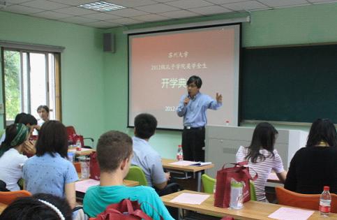 2012年9月28日下午两点半,苏州大学2012级孔子学院奖学金生开学典礼在校本部第四教学楼蕴含着浓厚中国文化气息的二楼大教室隆重举行。国际合作交流处处长黄兴、文学院党委书记王六一、研究生部培养办公室主任唐建新、文学院汉语国际教育专业主任吉旭老师出席了本次别开生面的开班典礼,典礼由文学院副院长逢成华主持。