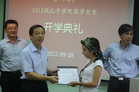 伴随着中国经济走向世界,中国的国际影响日益扩大,中国文化撩开了以往神秘的面纱,开始走到各国友人的面前,全球范围内的民众都更想直接了解中国文化。苏州大学迎来了新一届孔子学院奖学金生,使得实现文化交流、文化大融合的畅想更上一个台阶。文学院党委书记王六一先生对参加此次2012级孔子学院奖学金生开学典礼的全体师生表示了热烈而诚挚的欢迎,字里行间流露出的对外国学生的亲切关爱之意更是拉近了中外师生间的距离。王书记热忱地说:“我们欢迎你们,你们要相信我们!”