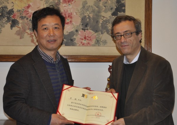 讲演结束后,文学院院长王尧教授还向两位法国著名汉语学者颁发了苏州大学汉语及汉语应用研究中心聘请其为兼职研究员的聘书。