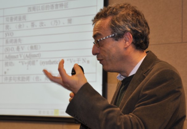 贝罗贝教授首先介绍了历史语法研究与语言类型学的关系,他指出要等到20世纪70年代随着Greenberg的共相研究的发表,历史语法研究与类型学才有了密切的联系,而在汉语史领域及现代汉语方言研究领域,这种结合则发生得更晚。接着,贝罗贝教授介绍了语法结构在历史上的演变,他认为新的语法形式的出现只有三种机制:类推(Analogy)、重新分析(Reanalysis)和外借(External borrowing),并列举了上古汉语中的一些语法演变现象,以证明他的发现和立论的合理性和所具有的说服力。最后,贝罗贝教授还介绍了语言类型学在语言区域(语言联盟)的确认过程中所起的作用。贝罗贝教授谙熟包括古今汉语、英语、维吾尔语等在内的七八种语言,所以讲演时视野开阔,语料丰赡,让人目不暇接。