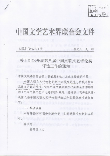 “中国文联文艺评论奖是经中央批准的唯一的综合性国家级文艺评论奖项”(《关于组织开展第八届中国文联文艺评论奖评选工作的通知》),由中国文联主办,评奖对象涵盖文学、戏剧、电影、音乐、美术、曲艺、舞蹈等12个艺术门类。该奖项设立于2000年,每两年评选一次,旨在按照中央关于加强文艺评论工作的指导精神,评选优秀文艺评论文章,表彰优秀文艺评论工作者,推进全国文艺评论的创新和繁荣,促进文艺事业健康发展。