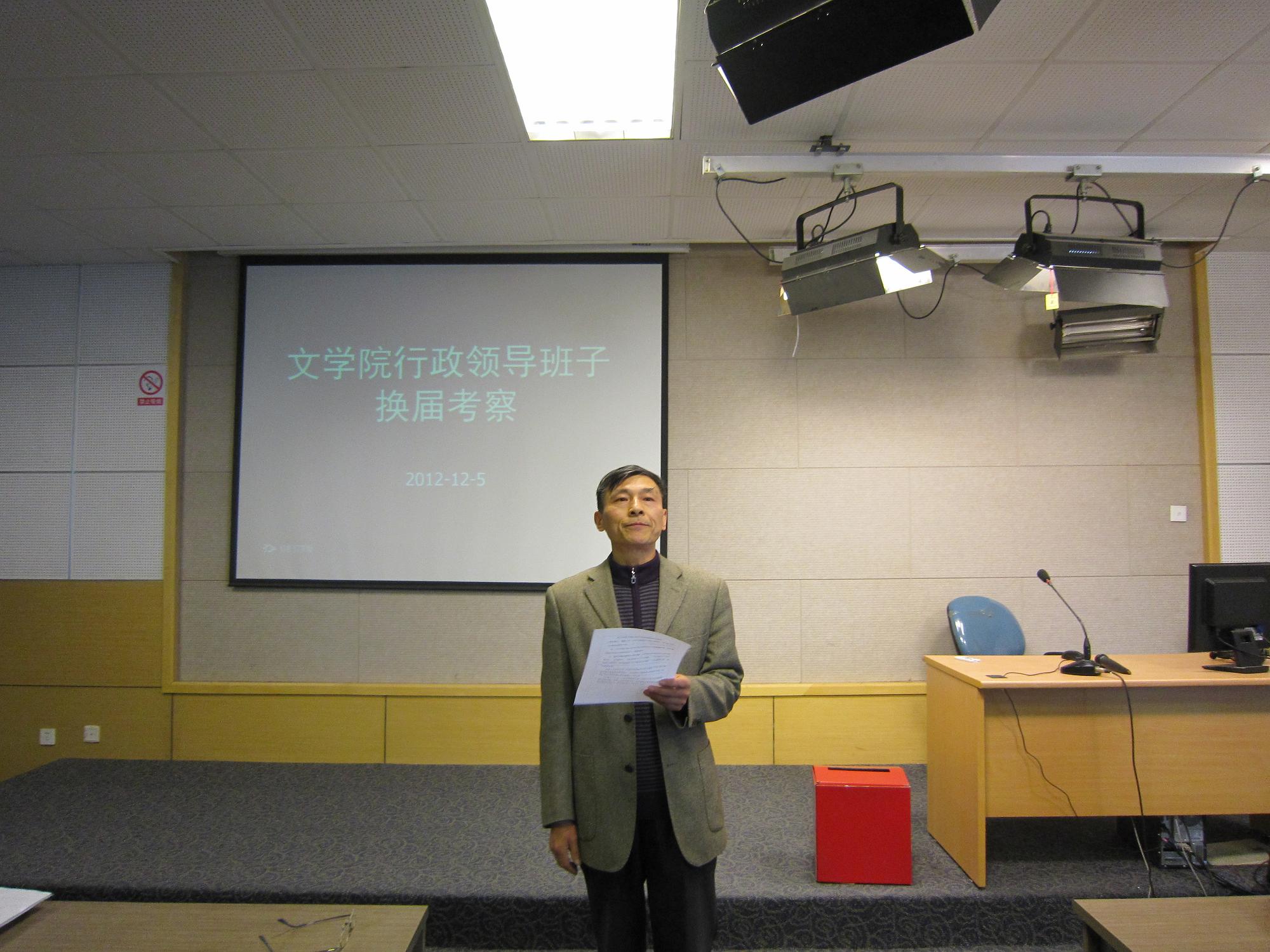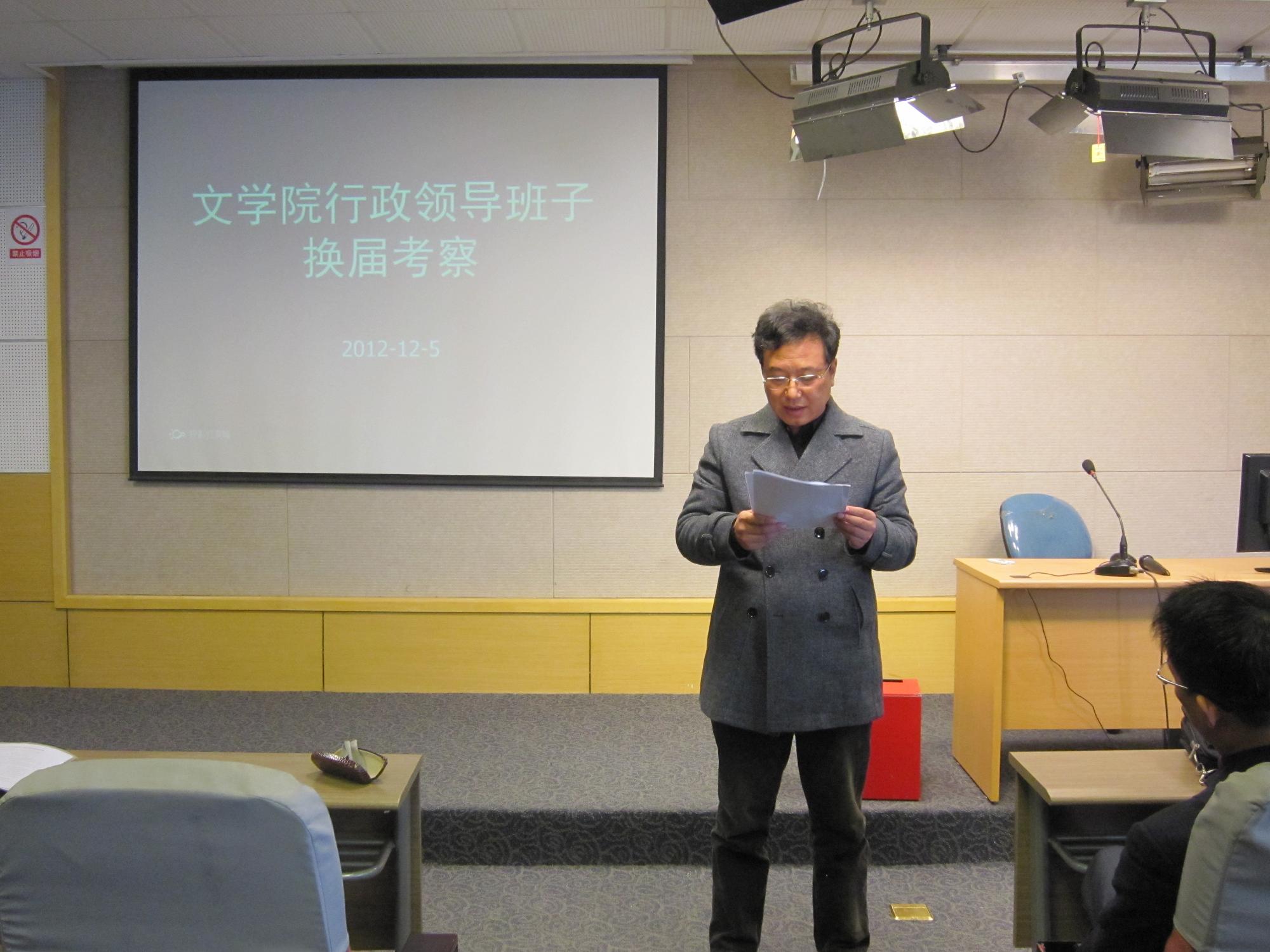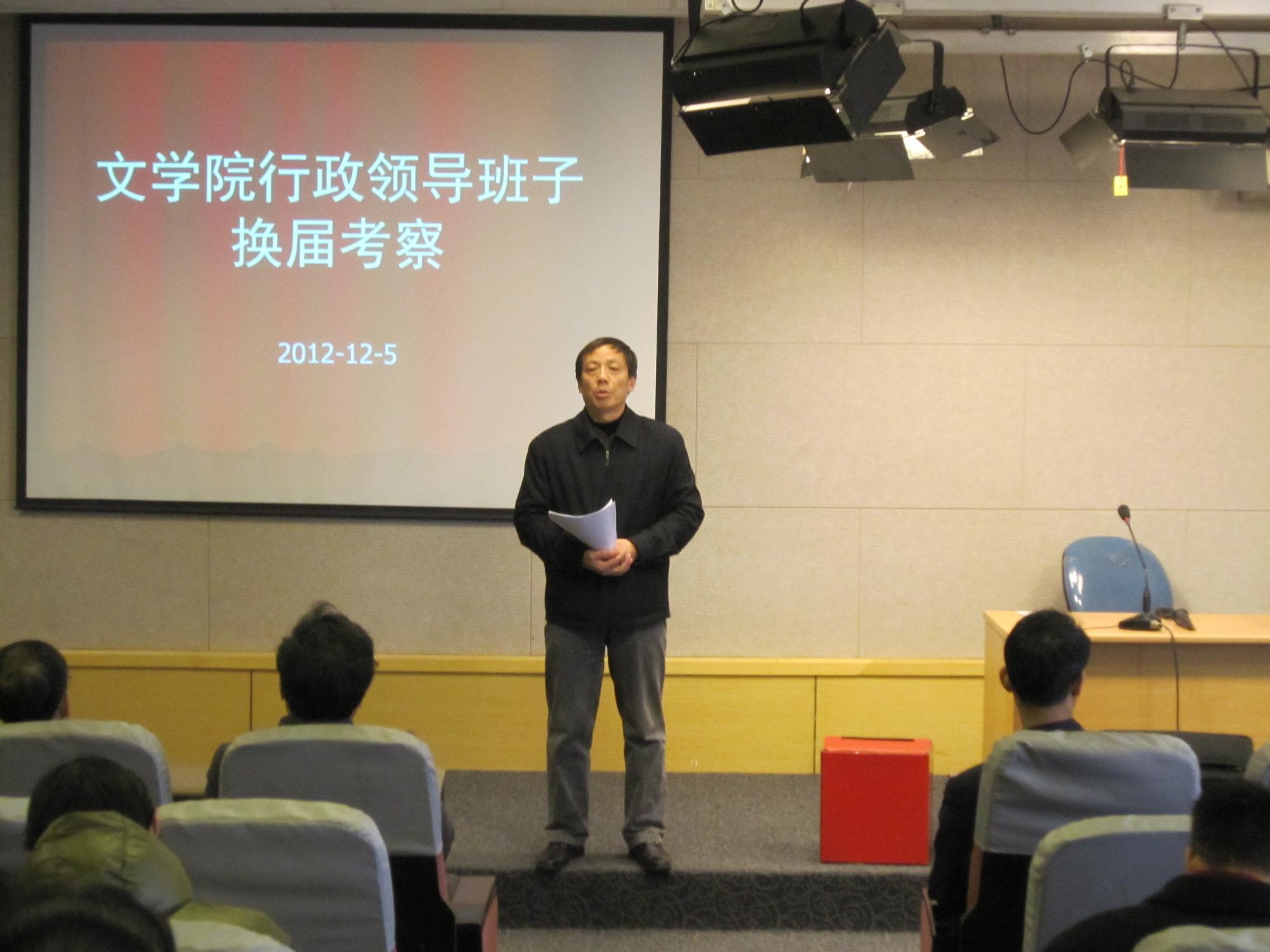 文学院行政领导班子换届考察会议于2012年12月5日下午在文综5339室举行,全院在职教工与会。由校党委组织部邓敏部长等四位组成的考察小组成员莅临会场,会议由邓敏部长主持。