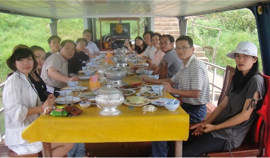 我到了老挝,已经是傍晚了,抵达宾馆简单洗漱之后,我就被老挝苏州大学的一群同事簇拥着来到了当地一家中档的餐厅。餐厅装修算不上富丽堂皇,相当于我们国家90年代的水准,但非常干净。那天晚上我们十几个人,非常哈逸,喝酒聊天之外,还唱了不少卡拉欧凯歌曲,结束的时候差不多快到凌晨1点。令我奇怪的是,服务员小姐的表现,始终笑眯眯的在一旁随叫随到的提供服务。而且我还发现一个细节,她们给客人斟酒的时候总是要等你叫的。我立马联想到我们国内的饭店服务,过了她们下班的时间,各种表情和动作都在暗示你该结束了,而如果她想给你加酒或者饮料,反而又总是不声不响,给你的杯子装的满满当当。后来,老挝苏州大学校长助理谭玉坤老师告诉说,老挝是特别的地方,她是小乘佛教的发源地,现在几乎还是家家信佛,城市里寺庙的数量多于高档饭店。哦,我一下子就明白了。
