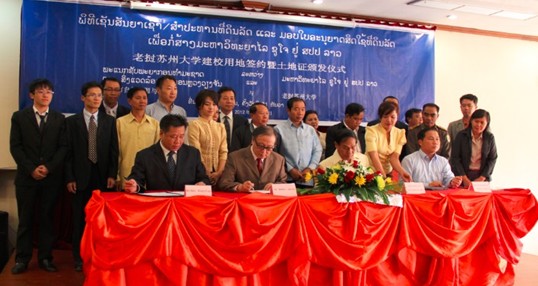 在老挝苏州大学成立之后,具有一百多年悠久历史的苏州大学,凭借雄厚的办学实力,自2009年以来,投入了巨大的人力、物力和财力,在短短的时间内,已经将老挝苏州大学建设成为老挝民众心目中非常理想的国外先进大学。老挝苏州大学一期校址位于万象市东北,与老挝最著名的大学老挝国立大学门对门。2012年12月31日,老挝苏州大学与万象市自然资源与环境厅在老挝万象市隆重举行了老挝苏州大学建校用地协议签约暨土地证颁发仪式,老挝苏州大学取得位于万象市万象新城的23.4724公顷二期建校用地。这是老挝政府献给老挝苏州大学2013年的一个最好的新年礼物,也是给了所有的苏大人一个自由探索的广阔平台。可以预测的是,不久的将来,一个美丽迷人的国际型高等教育校园将在老挝诞生。