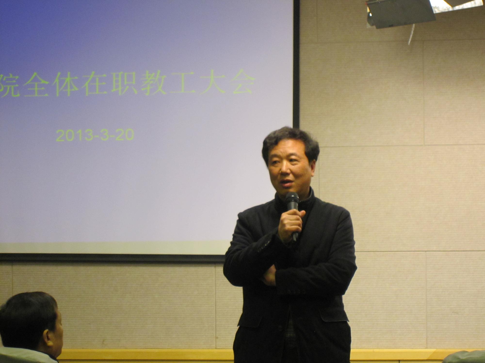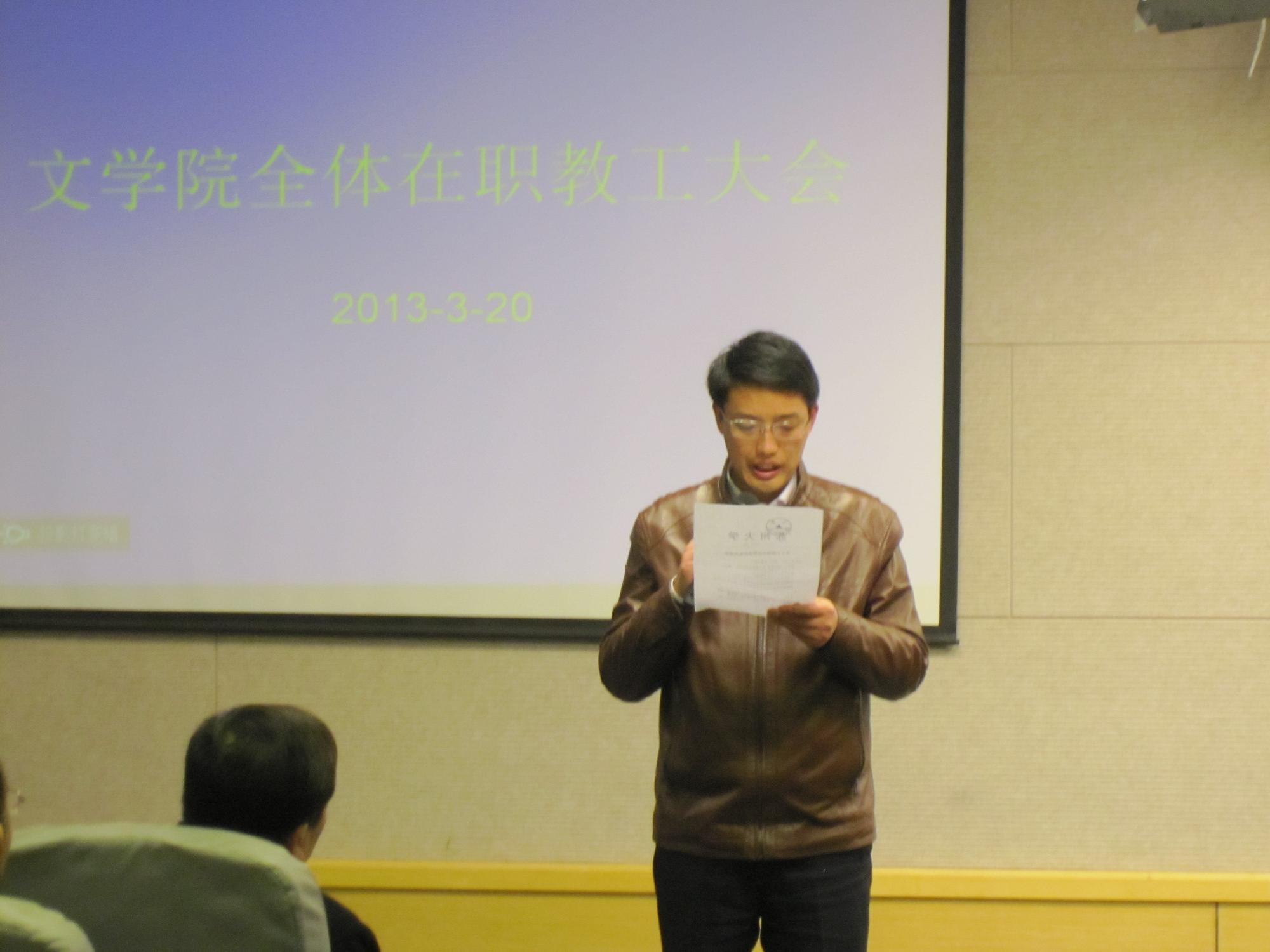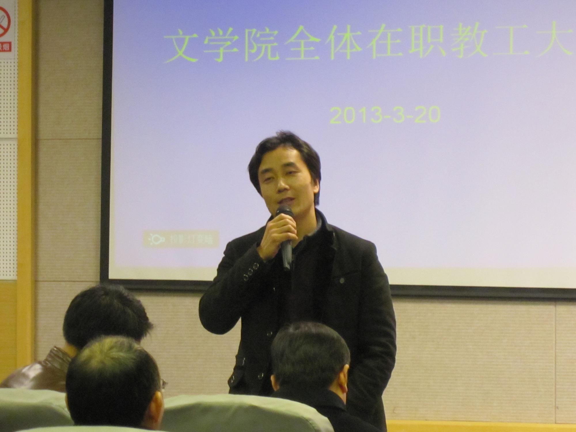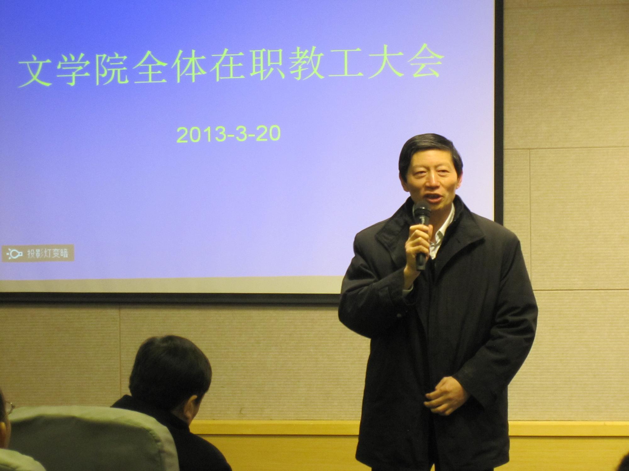 2013年3月20日下午2点,文学院在文综楼5339室召开全体在职教工大会,苏州大学校长朱秀林、组织部部长邓敏以及校办主任刘标出席了会议。