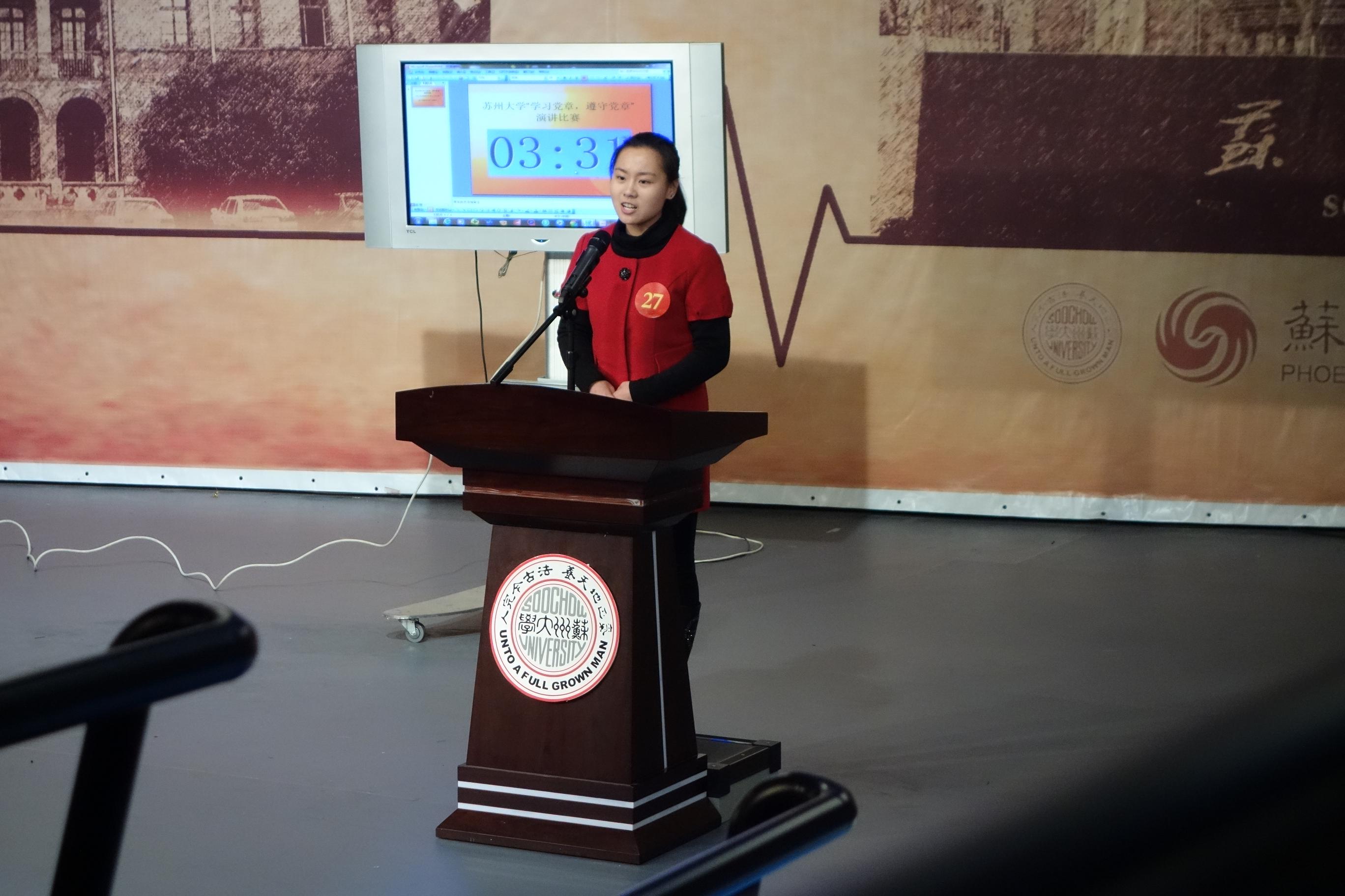 3月27日下午,苏州大学“学习党章,遵守党章”主题演讲比赛在独墅湖校区凤凰传媒学院演艺厅隆重举行。来自全校7个校区22个学院的师生共36人参加了比赛。我院2012级研究生张翼同学表现出色,声情并茂的演讲折射出我校学生党员奋发向上、敢为人先的青春风貌,深深地打动了现场观众。最终以92.7分荣获一等奖。