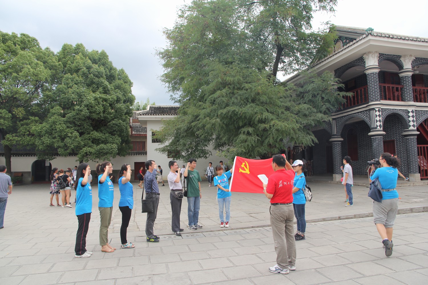 党员们在遵义会议会址前展开鲜红的党旗,在文学院党委副书记张健老师的带领下,全体师生党员向党旗庄严宣誓,参加宣誓的有教工一支部党支部书记艾立中老师、教工二支部党支部书记吉旭老师、本科汉语言文秘支部党支部书记纪金平老师、本科汉语言(师范)支部党支部书记赵曜老师、学生党员等。宣誓完毕后,无论是教师党员还是学生党员都表示,在这样一个特殊的地方重温入党誓词,给大家上了一堂生动的党课,很有现实教育意义,以后一定要以党章的要求严格要求自己,以长征精神激励自己,更加努力学习和工作,为国家的繁荣昌盛贡献自己的力量。