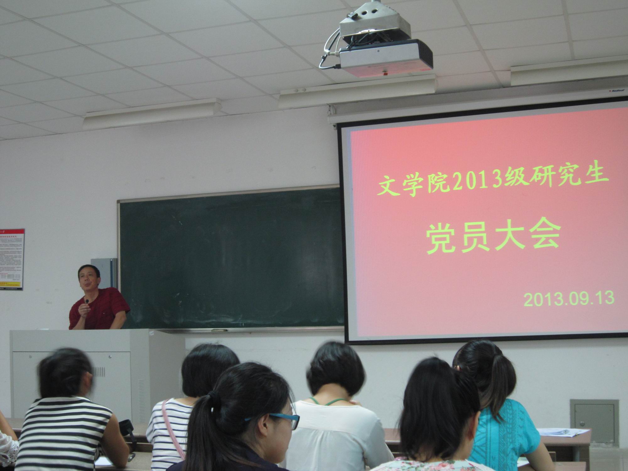 2013年9月13日下午四点,文学院2013级研究生党员大会在文综1002#2101室召开。文学院党委书记王六一、组织秘书钱继云出席了此次会议,文学院2013级全体党员参与了大会。本次会议由钱继云老师主持。