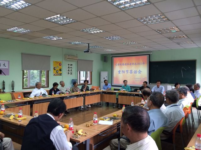 2013年10月11日下午2点,文学院离退休老同志2013年重阳节茶话会在本部第四教室举行。文学院党委书记王六一、副书记张健、副院长逢成华、办公室主任黄晓辉及30余名老同志出席茶话会。本次茶话会由逢院长主持。