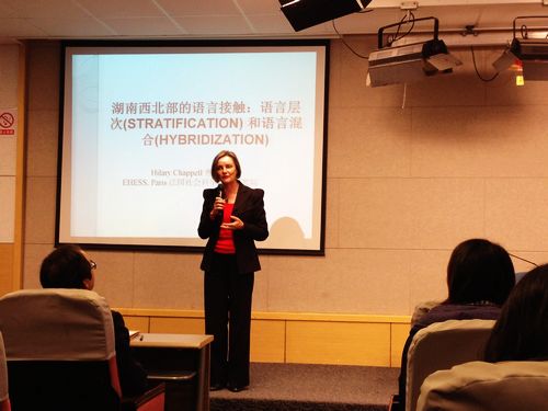 在讲座的最开始,曹茜蕾教授用英文问候了在场的同学们并表达了自己对苏州的喜爱之情。首先在导言中,曹茜蕾教授告诉同学们她近年来研究的语言区域是湘西。湘西的乡话由无亲属关系的语言围绕形成,它包括:苗语(苗瑶语族)和土家语(藏缅语族)。在介绍乡话的背景时,曹教授提到乡话是湖南西北地区即湘西偏远山区濒危语言之一:它是未被归类的汉语系语言,无文字传统,与汉语普通话、广东话和上海话相比有更保守的句法和词汇。而此次演讲的目的有两个,第一是从较少有人探究的有亲属关系的语言间的接触现象出发,考察湖南西北地区乡话语言层次和语言混用的结果;第二是分析乡话外借西南官话的两套句法现象,用否定与比较结构为例和从语言融合的几个阶段来解释每种句法类型的结果。