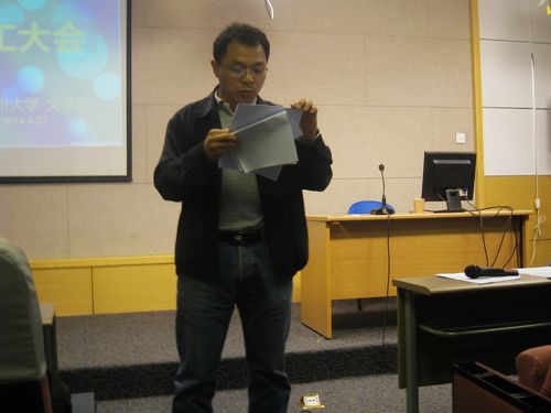 会议由文学院党委书记王六一老师主持。此次教职工会议有三个议程:学习习近平总书记讲话的精神、教学工作部署以及职称民意测评。