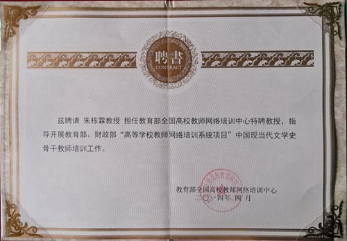 朱栋霖教授被聘为教育部全国高校教师网络培训中心特聘教授,并获授特聘教授证书,指导开展教育部全国高校骨干教师培训工作。