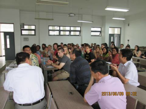 最后,本次项目美国俄亥俄州立大学的负责人简小斌教授用英文和同学们进行了沟通。简老师请同学们猜一猜黑板上的“读万卷书”是什么意思,并问这句话的下一句是什么。这个问题,大部分的学生都不知道如何作答,来自本部校区的唐伟力同学最终说出了这个问题的答案。简老师对这句话进行了解释,并认为CLS项目就是“读万卷书,行万里路”这一哲理的最好诠释。同时,他又向大家提出“知行合一”的概念,并对其进行了解释。简老师用简单的两个中国熟语解释了本次项目的性质,并让学生们了解了更多的中国文化,受到了美国学生的欢迎。