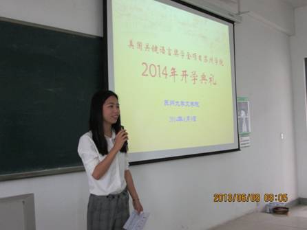 开学典礼首先由语伴代表10级对外汉语专业的眭萍同学发言,作为连续两次参与CLS项目的语伴,她与大家分享了一些去年参加项目的感受。首先,她指出“语伴计划”是CLS项目非常独特的组成部分,可以让学生们在课下有面对面接触中国年轻人的机会,是一次“VIP”的教学,她巧妙的比喻逗笑了台下的美国学生,现场的气氛也活跃起来。其次,她说道,项目虽然很有趣很实用,但也很辛苦,希望所有的学生,包括语伴都能准备好。虽然辛苦,但是她相信今年项目结束的时候,所有参与其中的学生一定会觉得这两个月的时间是非常难忘的。作为语伴代表,眭萍同学向美国的学生们保证,苏州大学精心选拔的语伴定会做好自己的工作,尽全力帮助他们学习中文,也希望所有美国学生能跟语伴们一起加油。最后,她代表所有语伴感谢苏州大学、俄亥俄州立大学,以及CLS项目给语伴们提供了这个机会,并祝愿今年的项目更加成功。