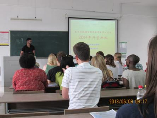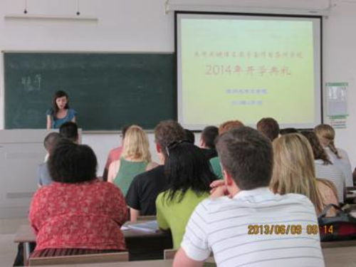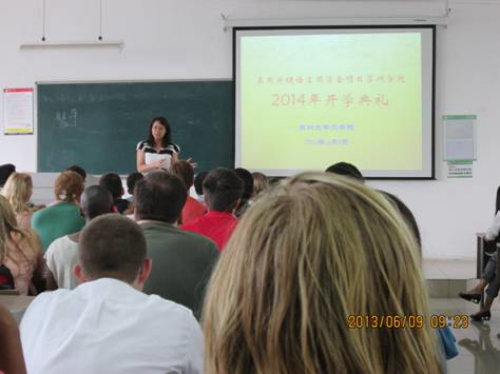 2014年6月9日上午九点,美国国务院关键语言奖学金项目(以下简称CLS)苏州大学学院开学典礼在独墅湖二期1003幢3503教室隆重开幕,来自美国不同大学的共52名美国学生,以及本次项目的任课教师代表、志愿者代表、俄亥俄州立大学――苏州大学汉语国际教育中心美方主任简小斌教授、苏州大学文学院的党委书记王六一、教学副院长李勇,行政副院长、中心中方主任逢成华等领导参与了本次开学典礼。CLS项目是由美国政府从全国重点高校中选拔优秀学生于暑假去目的语国家进行为期8周的语言强化的项目,学生所有的费用由美国政府承担。CLS中文项目由美国俄亥俄州立大学承办,与苏州大学的合作关系开始于去年,鉴于去年在苏州大学取得的优秀教学成果,今年的CLS项目决定在苏州大学扩大办学规模,设立了本部校区和独墅湖校区两个教学点,这是CLS项目运行以来首次在一所学校设立两个教学点。此外,俄亥俄州立大学的中文旗舰项目中心也由青岛海洋大学迁至苏州大学本部。不论是学生数量,还是项目质量,与去年相比都有所提高,可见双方合作十分融洽