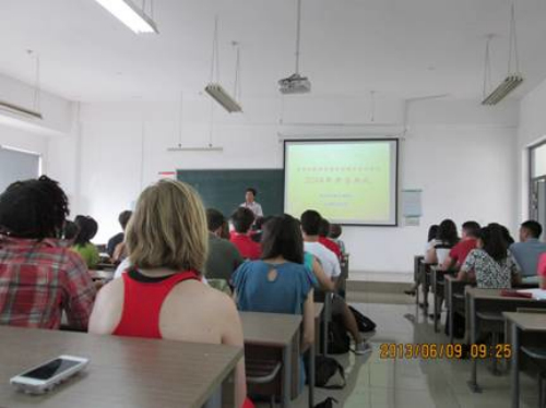 学生代表发言结束以后,是老师代表发言。首先由苏州大学海外教育学院的周国娟老师代表所有任课教师发言。她介绍了两个校区不同的老师,同时,通过问问题,和学生进行了有效的互动。她表示,去年的项目结束以后同学们的中文水平普遍都有很大的提高。今年的教材在去年的基础上又进行了改进。因此,在学习的时候,同学们一定会取得更大的进步。