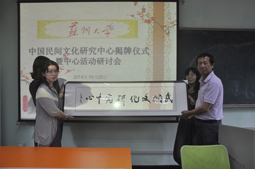10月20日,文学院民间文化研究中心揭牌仪式在天赐庄校区第四教室举行。中国民俗学会副会长、北京大学中文系教授陈泳超,台湾彰化师范大学国文系教授丘慧莹及苏州大学、苏州市民俗学者15人共同出席了揭牌仪式。仪式由民间文化研究中心人负责人徐国源教授主持。著名民间文化学者陈泳超、丘慧莹教授共同为研究中心揭牌。