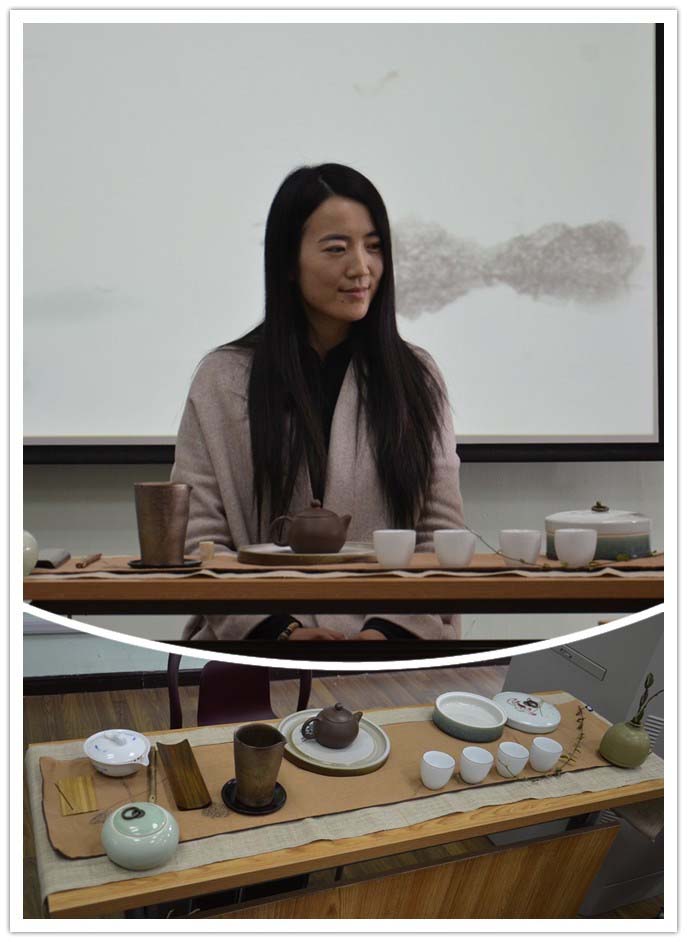 然后苏老师给同学们茶席的布置。她首先拿出吃茶所用到的一些茶器,并指出茶器的名称以及在茶席上摆放的位置。同学们听完介绍后,都认识了很多的茶器,并且了解到了茶器摆放的一些讲究。之后苏老师对同学们说,万物皆有情,对于每一件茶器,我们都要有一颗欢喜心,要有惜物的情怀。这样即使我们用最简单的茶器,也能泡出最好喝的茶。苏老师的一番话,让同学们深有感触。