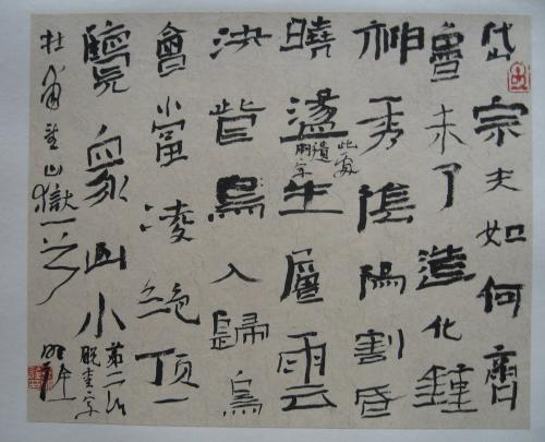前些年也有朋友提出要“激活唐楷”,但我实在想不出是怎样的“激活”法。想唐之后一千多年,宋元明清直到民国,出了多少大师天才啊,除了赵孟�还有谁敢在楷书方面与唐人相提并论?就是老赵,虽然和人家颜、柳、欧排在一起说,但从笔法上看,根本就不是一回事,老赵是行书慢写,不能叫“唐”楷,只能叫“元”楷。这是“激”活吗?其实是“绕”活了而已。所以,我主张要“绕活”唐楷。我真诚期望有人能在我这个不成熟的观点基础上,理论地、系统地丰富发展,比如研究研究“绕活二王”、“绕活汉隶”、“绕活秦篆”直至“绕活经典”、“绕活传统”等一系列的重大课题。依稀记得是在哪届全国展上,有一件模仿颜真卿自书告身的四条屏获了大奖,让大家眼前一亮,确实唐楷颜体模样,不知这算不算是激活了唐楷。反正后来看到的楷书,基本上都跑到本文下一段文字的内容里去了。