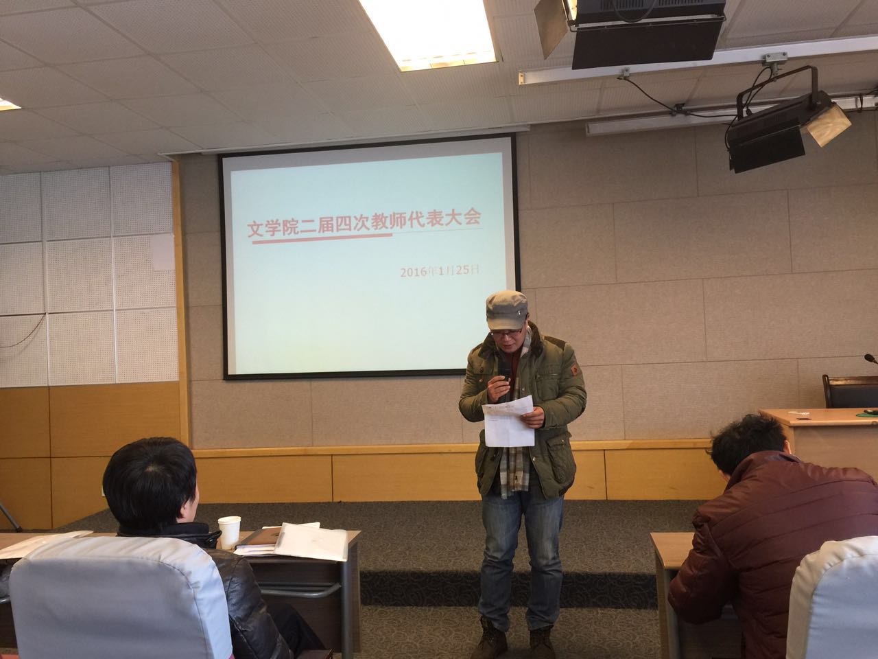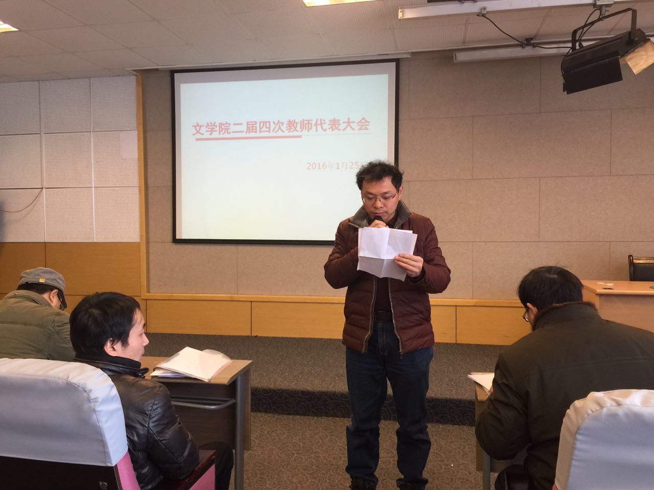 2016年1月25日,伴随着庄严肃穆的国歌,文学院二届四次教代会在文综楼1005-5339教室顺利召开。