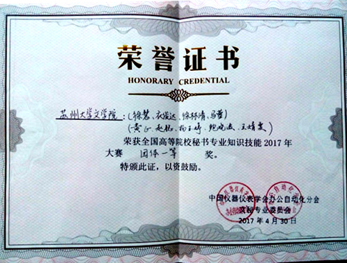 2017年4月29日至30日,“全国高等院校秘书专业知识技能2017年大赛”在上海工商外国语职业学院隆重举行,来自全国16个省份的34所院校、53个参赛队、200多名学生参加了此次大赛。我院秘书学专业2014级徐慧、黄正、衣俊达、杨玉婷、王婧雯、赵聪、鲍晓波、徐林清、马蕾九名同学组成两队,在吴雨平、倪祥妍和李一三位老师带领下参加了此次大赛,经过激烈角逐,最终荣获团体一等奖。