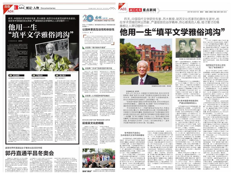 昨天上午7时35分,中国现代文学研究专家、苏州大学文学院教授、首届“姑苏文化名家”范伯群先生因病在苏州逝世,享年86岁。惊闻范老逝世的消息,“范门子弟”、苏州大学的领导都前往送范老最后一程。