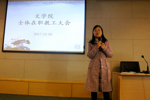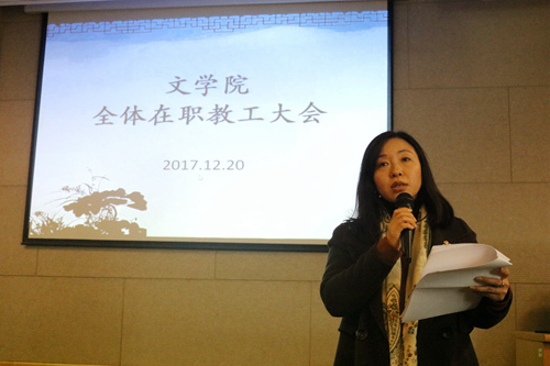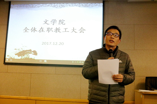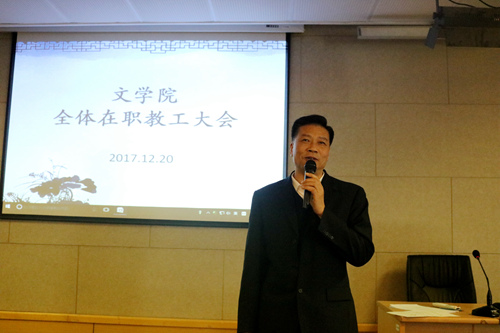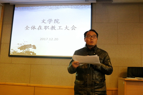 2017年12月20日14:00,文学院全体在职教职工大会于1005#5339会议室顺利召开。副校长杨一心、校党委组织部副部长王成奎一行出席会议。会议由院党委书记孙宁华主持。