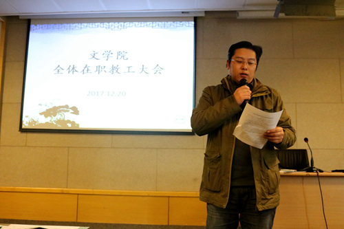 接着是学院领导班子及处级领导干部对2017年度的主要工作进行述职述廉。孙书记指出,文学院在2017年度收获颇丰,在班子尚未配齐的情况下,班子成员抱团作战、精诚合作,全体教师共同努力,使党委工作和学院各项发展工作得以有序开展。在充分肯定了丁治民教授荣获吴玉章人文社会科学奖、曹炜教授成功申报国家重大项目、文学院分团委获评“省五四红旗团委”等显示度较高的成绩后,也对德高望重的范伯群老先生的离世深切缅怀。丁治民副院长从科研项目、教学工作、师资建设等方面进行了工作总结,提出了希望学校加大培养年轻教师力度的愿望。张洁副院长就文学院的行政管理和社会服务创收工作进行了总结,指出学院的创收工作是解决学院工作后顾之忧的重要一环,目前学院创收情况仍需改善。阴浩副书记从党员培训、学工建设、学生工作、大型宣讲活动、学生国际交流与文化活动等方面进行了总结。全院教工结合班子及各位领导干部的工作实际,分别对其德、能、勤、绩、廉进行了民主测评。