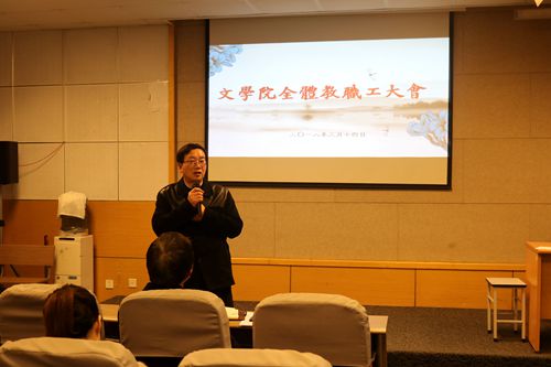 2018年3月14日下午,文学院全体教职工大会在1005#5339报告厅召开。此次大会由党委书记孙宁华主持。