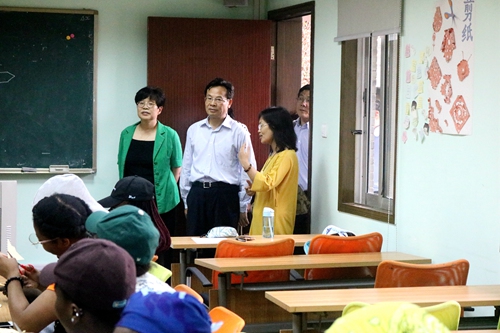 在留学生们沉浸在剪纸的魅力中时,苏州市委常委、统战部部长姚林荣,我校党委副书记、副校长路建美,苏州市侨办主任杨新,我校党委常委、统战部部长张国华莅临视察。留学生们认真的神情和完整的作品令大家赞叹不已。视察结束后,俞同学和蔡同学继续进行剪纸教学,并让留学生们进行了作品展示。课堂到此接近尾声,最后,两位研究生同学和留学生们合影留念。