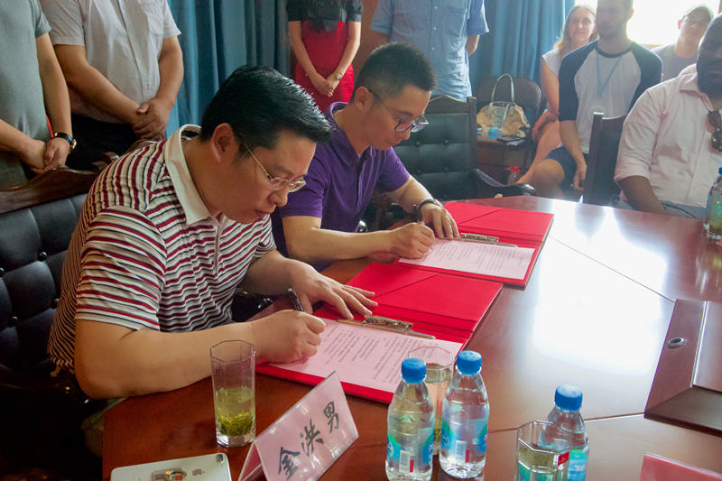 接着,文学院党委副书记、副院长阴浩和黄天源总经理陈磊现场签署校企战略合作协议书。苏州市商务局、姑苏区经济和科技局、苏州大学文学院及协会相关负责人分别为“苏大文学院海外留学生教学基地”、“苏大中国传统文化工作坊实践基地”揭牌。在CLS项目留学生和苏大师生以及黄天源的领导、师傅们见证了这一历史性的时刻后,又一同观看了《舌尖上的中国》,为下面的体验制作糕点预热。