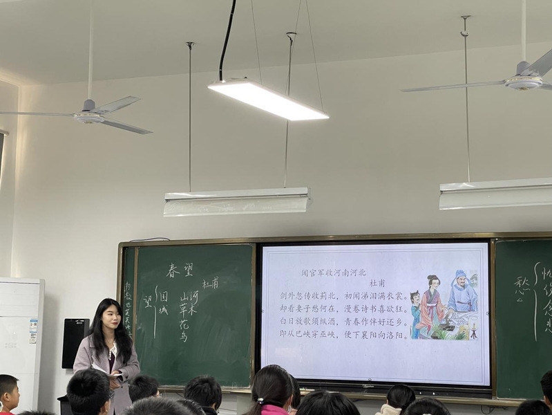 本次公开课的授课篇目为《春望》,实习生徐成煜同学从诗题“春望”讲起,接着紧扣文本,通过炼字的方式,对关键字词进行了解读。在此过程中,徐成煜适时引入了时代背景,引导学生通过“知人论世”的方法,进一步理解“感时”“恨别”的深层次内涵。接着,徐成煜设计了“一封家书”的任务,让学生站在杜甫的角度写家书,引导学生从“诗史”的层面深入理解杜甫的家国情怀。最后,徐成煜列举了杜甫的相关诗作,借助新颖的合作朗读的形式,带领学生感受诗人坚定不移的爱国之心。
