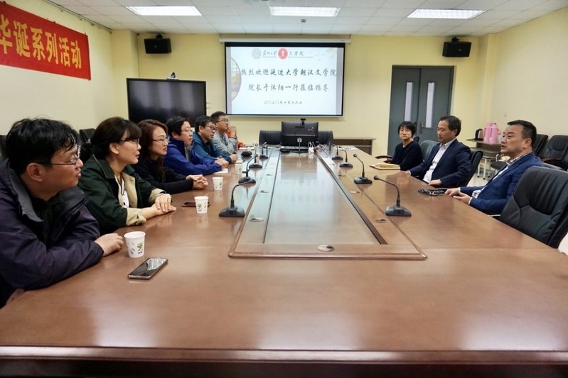 10月16日下午,延边大学朝汉文学院副院长于沐阳一行莅临我院,我院在文科综合楼1005-5335会议室召开欢迎座谈会,双方就本科生培养、特色学科发展建设等方面的问题进行了讨论。此次会议由文学院副院长周生杰主持并邀请古代文学教研室主任张珊老师和钱锡生教授到现场分享自己的教学经验,延边大学朝汉文学院副院长于沐阳、汉语言文学专业学科主任王启东、李娟教授、季南副教授、马达老师、朴日成老师、李明达老师等出席了会议。