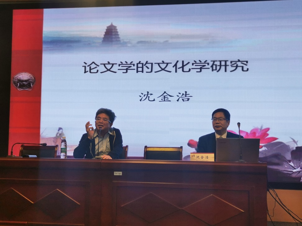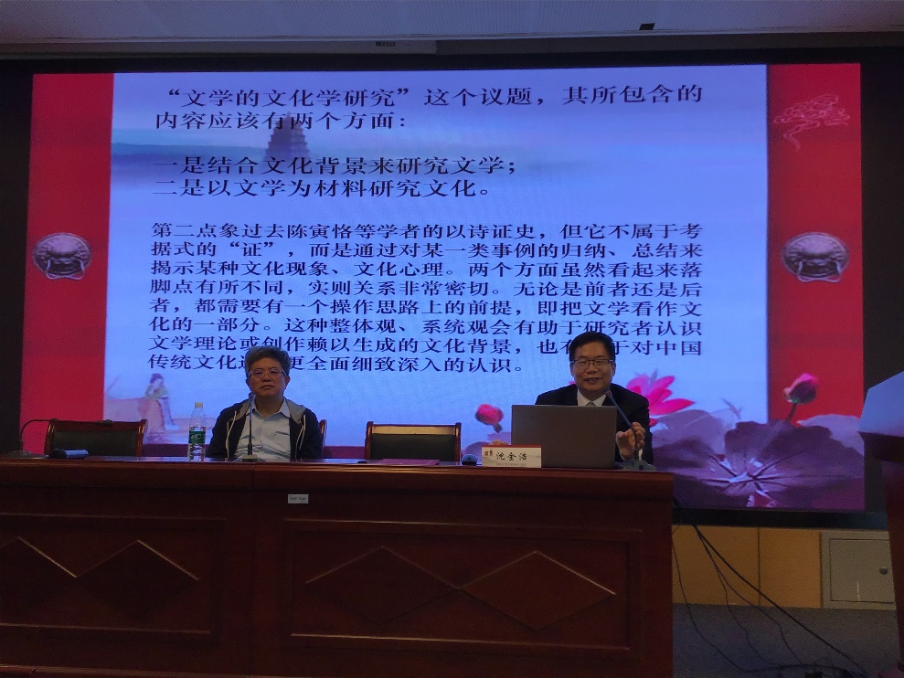 沈金浩教授的讲座内容分为两部分:第一部分为“结合文化背景来研究文学”。他以公安派的“性灵”理论为例,提出结合文化背景研究文学最大的意义就是方便研究者探清某种文学理论或创作现象的成因;以李清照作品被看作有“丈夫气”为例,提出到文化背景因素中去寻找该现象的形成原因;以中外山水诗、爱情诗的比较为例,将文化角度研究意义与研究文学背后的民族文化特性相挂钩,便于各理解各种文化的深层意。