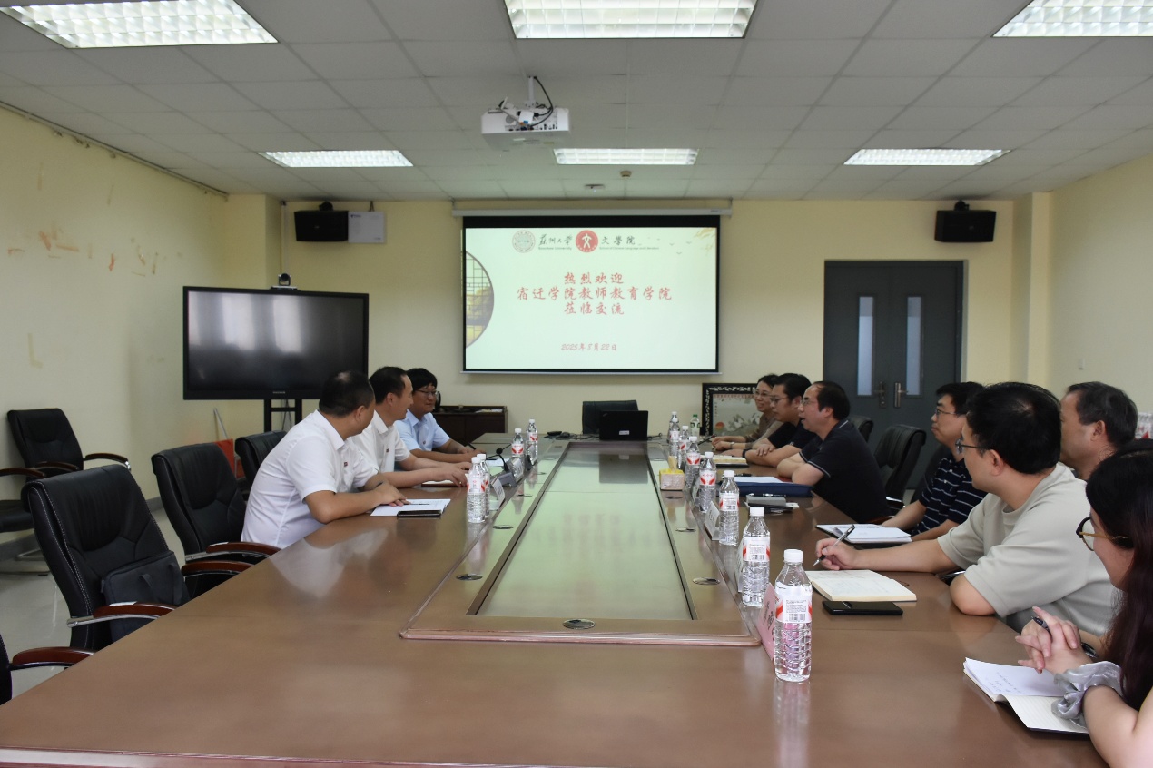 交流讨论环节,双方回顾了苏州大学与宿迁学院多年来的合作历程,以及两校深厚的情谊与合作精神。并就师资力量、班子队伍建设、科研经费管理以及学院发展面临的各种挑战进行了探讨。