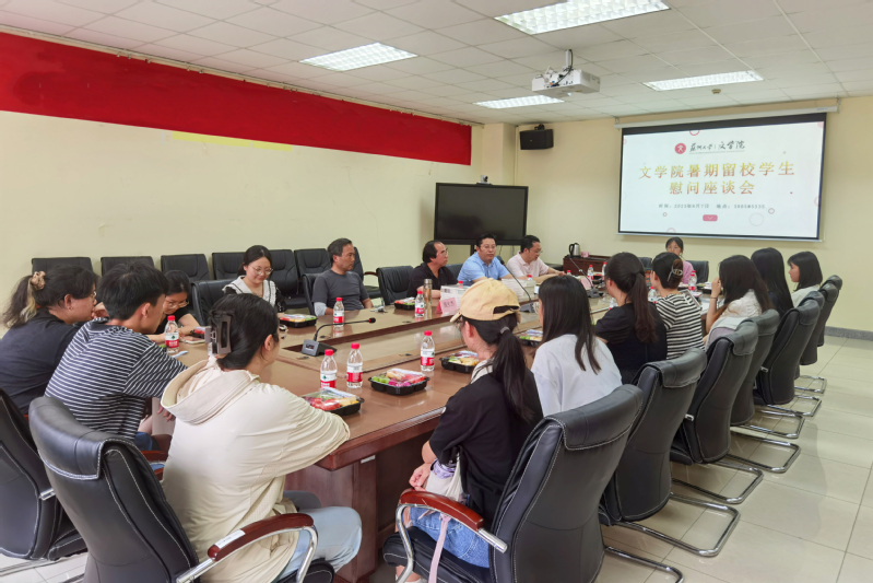 2023年8月7日下午两点,苏州大学文学院暑期留校学生慰问座谈会在独墅湖校区1005#5335举行,出席本次活动的有文学院院长曹炜、党委副书记阴浩、教学副院长周生杰、学工办主任纪金平以及部分暑期本科留校学生。与会师生一起畅谈留校生活,学生之间交流考研复习经验,共赴学海征程。