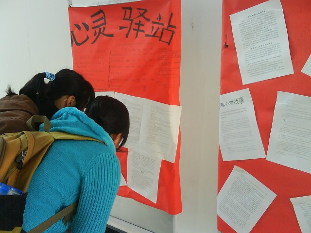 为了使更多同学更方便地联系我们,心理部不久前新增了“怡心苑”模块,以后同学们有什么心理疑惑只需发送E-mail就可以了。在这次心理健康知识展板展板上,“怡心苑”邮箱地址被醒目地标识出来。同学们看后都很欣喜,他们说,以前有什么心理疙瘩解不开,很想联系心理部同学去“搬救兵”,但终因联系不便而作罢。现在开辟了“怡心苑”模块,通过互发电子邮件交流更快捷了,而且有关保密性等他们往日关心的问题也一并得到了很好的解决,心理部这一新举措受到了同学们的一致欢迎。