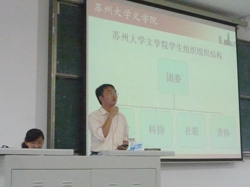 当晚18:00左右,招新大会的场物工作已基本就绪。大会于18:30准时开始。首先是徐海洋老师上台发言,他对文学院学生会、科协、社联做了简要介绍,,并向09级新生提出要求和期望。他指出要遵守学校的规章制度,要处理好学习与工作的关系,要谨记苏大的校风院风。在谈到学位证书时,徐老师微笑并郑重地说:“一个都不能少。”胡萱老师随后上台介绍学生会。胡老师亲切地欢迎09级新生,称他们为“新鲜血液”,并希望新生们能把学校、文学院、学生会都真正当成自己的一部分,并认真负责地做好自己的本职工作。胡老师还就新生们入学后的困惑做了耐心的解答。接下来是纪金平老师上台发言,纪老师提到了刚结束的军训留给大家的无限感动,大家的汗水与付出必将得到回报,并希望新生们能把集体荣誉感同样运用于班级和社团。