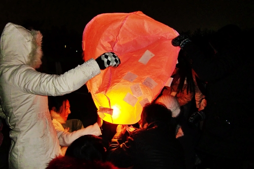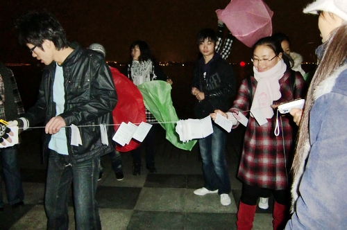 在点燃第一个孔明灯时,由于风太大,同学们围成一个圈聚集在一起,也许是祝福太多、太沉了,当大家放手时,它没有飞向天空,而是飘向了湖面。在大家的共同努力下,它终于晃晃悠悠地飞了起来。看着承载着祝福的孔明灯,大家欢呼着,心中充满了感动和温暖。