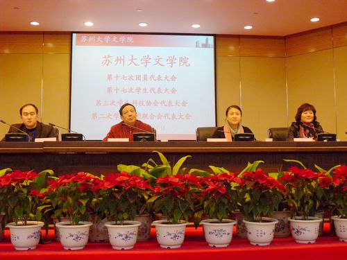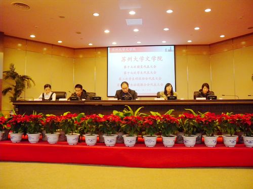 2009年12月30日,苏州大学文学院第十七次团员代表大会,第十七次学生代表大会,第三次学生科技协会代表大会,第二次学生社团联合会代表大会在独墅湖校区炳麟图书馆学术报告厅隆重召开。本次会议分为四个部分:预备会议,开幕式,正式会议及闭幕式。