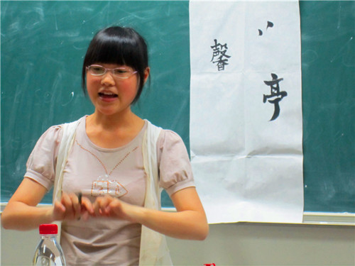 活动开始由社长朱尧向大家介绍了中国悠久而富有魅力的软笔书法,而后,云天书画社的陈金燕同学,为大家详细的讲解了毛笔书写的注重点:形与神的结合。陈金燕同学一边在黑板书写做示范,一边向同学们讲解书写时要注意字的力量感、立体感、节奏感以及空间大小,这些是字的“形”;除了“形”,字的内涵还在于“神”,就是从字中看出书写者的情感,这是最高境界。最后,陈金燕同学还劝同学们要想写好字,还要勤于练习,勤于临摹名家字帖。