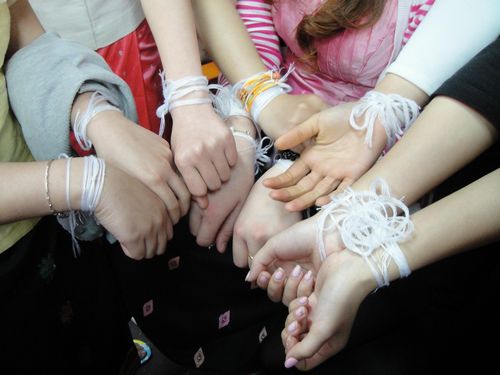 将近九点时,参加活动的人员已到齐。活动正式开始。首先是老师的一番讲话,虽然不懂老挝语言,但猜想下,肯定是对同学们的祝福吧,接着是这次活动的主办人的讲话,他把最真挚的祝福献给了所有人。现场一片欢呼,盛大的节日在嬉闹声中开始了。桌子中间放了用芭蕉叶扎起来的小树,上面插了好多用小木棒串起来的洁白的线条,编制的花纹也很漂亮。同学们对着“小树”开始许愿,然后把线条取下来互相佩戴,在手腕上绑满白线表达祝福。