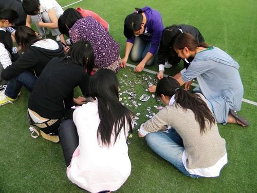 时近黄昏,有两个小队先后完成了拼图任务,分获第一、第二;其他队则还未拼出完整的图案,按照事先规定活动主办方以数余下拼图块数的方式决出了第三名。在忙碌的学习和生活中,能匀出短暂的时间来完成拼图这样一项需要静心和耐性的活动,同学们都觉得获益非常。