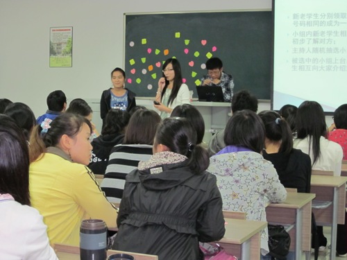 最后是学长学姐展销会。由09级的学生走上讲台,张贴促销广告牌,上面写着他们的姓名、产地和卖点。09级的学生们多才多艺,妙语横生。尽情展示了09级学生的随和、谦逊、可爱的形象。