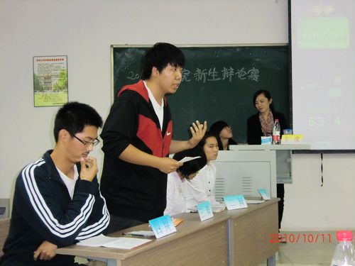 10月11日、12日,由文学院竞智思辨社举办的2010新生辩论赛初赛在文综楼顺利举行。初赛共分三场,由文学院10级6个班分三组进行辩论。本次辩论赛要请的评委有竞智思辨社前社长贾瑞雪、09级新生辩论赛全场最佳辩手郑丽莎,校优秀辩手冯金同、田诗瑜、崔宗祥、郭航宁、潘晓溪,社会学院击流辩论社社长朱桦、副社长董荣鑫。