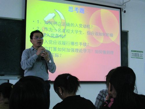 在入党动机中他指出要树立信念型的动机,即意志坚定,为共产主义而奋斗,肯接受但组织长期考验并按党员标准严格要求自己的心理状态。他要求,要通过努力学习邓小平理论、“三个代表”重要思想和科学发展观,提高认识;积极思考,认真实践;靠拢组织,接受帮助等途径来端正自己的动机。说到入党态度时,张健老师提出要勇敢的表达入党愿望,即写入党申请书,还要积极学习知识,参加社会工作,通过培训、自学、思考总结、理论与实践相结合的方法来提高理论修养,注重自我更新、提升内在素质,最后要主动接受考验以达到有坚定共产主义信念的目的。接着张健老师向学生介绍了一些入党的基本程序,包括党员考察的程序和入党的手续,给一些有入党意愿的学生提供了一些关于入党的详细指导。
