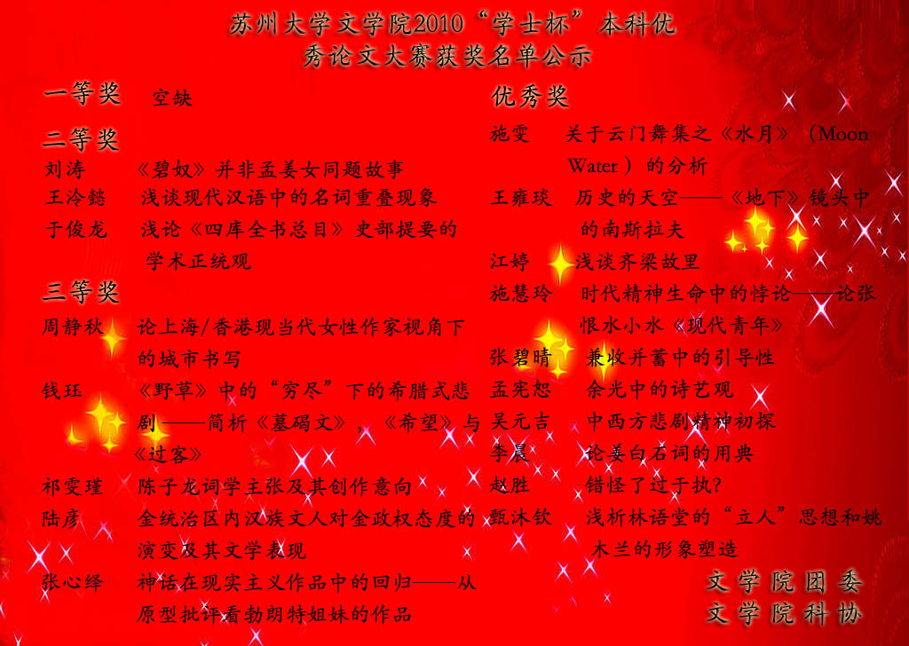 苏州大学文学院2010年“学士杯”本科优秀论文大赛获奖名单公示