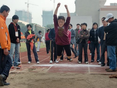 9点30的女子壮年教师跳远比赛中,文院的潘华琴老师巾帼不让须眉,她离弦似的助跑,蚂蚱似的起跳,空中的敏捷走步,落地距离的长度,让胜利和掌声都属于了她。通过完美的动作,潘老师取得了第一名的好成绩。