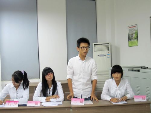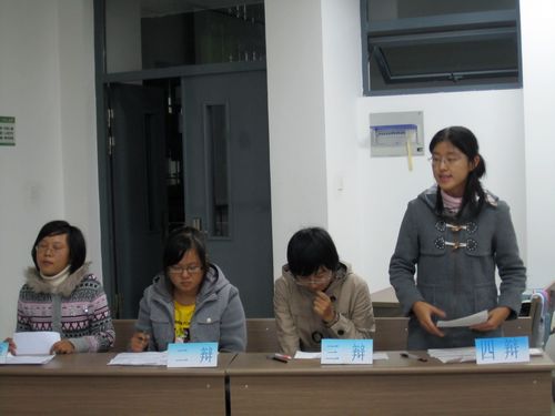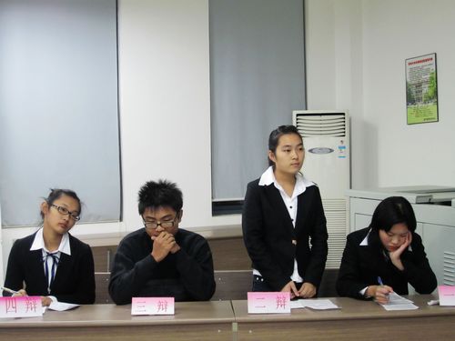 比赛正式开始,进行第一场比赛的是为角逐季军的正方踢馆队和反方师范二班的辩手,他们的辩题是“上海世博局应该接受烟草企业的捐款吗?”正方认为应该接受,反方认为不应该接受。经过精彩激烈的一辩陈词,公辩,双方互相盘问,和最最紧张的自由辩论环节后,评委还对双方对手提出了重要问题,然后至关生死的总结陈词部分中,双方四辩都做出了精辟,全面而又犀利的陈词。最后评委离席,三位评委走出教室开始商讨,大概十分钟后他们有了结论,穆杨学长宣布获得季军的是正方来自踢馆队的选手,获得最佳辩手的也是来自踢馆队的三辩陈子亮同学。大家鼓掌祝贺他们。