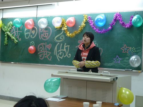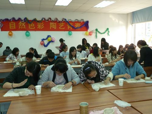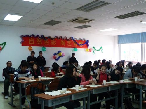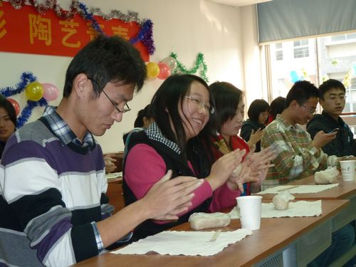 下午2:30,教室里已被工作人员布置一新,到处挂满了彩带与气球,显得温馨欢快,每个同学的面前摆放着一块陶泥和相关工具。首先,主持人简短的叙述了中国古代传统的陶艺文化和源远流长的陶瓷技术,然后介绍了参加此次活动的工作人员,包括邀请到人民日报的记者和来自现代陶瓷艺术馆的陶艺制作老师。